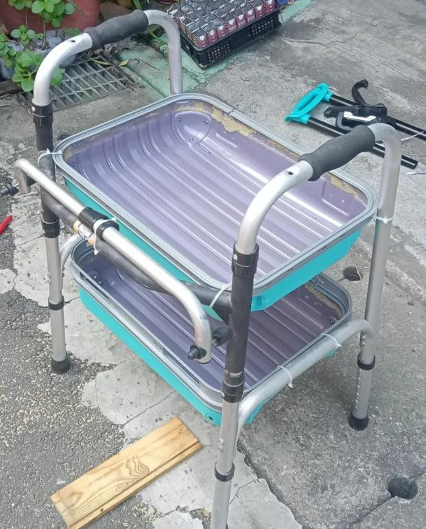 把行李箱拆开,拆成两个部分,然后准备4个支架,