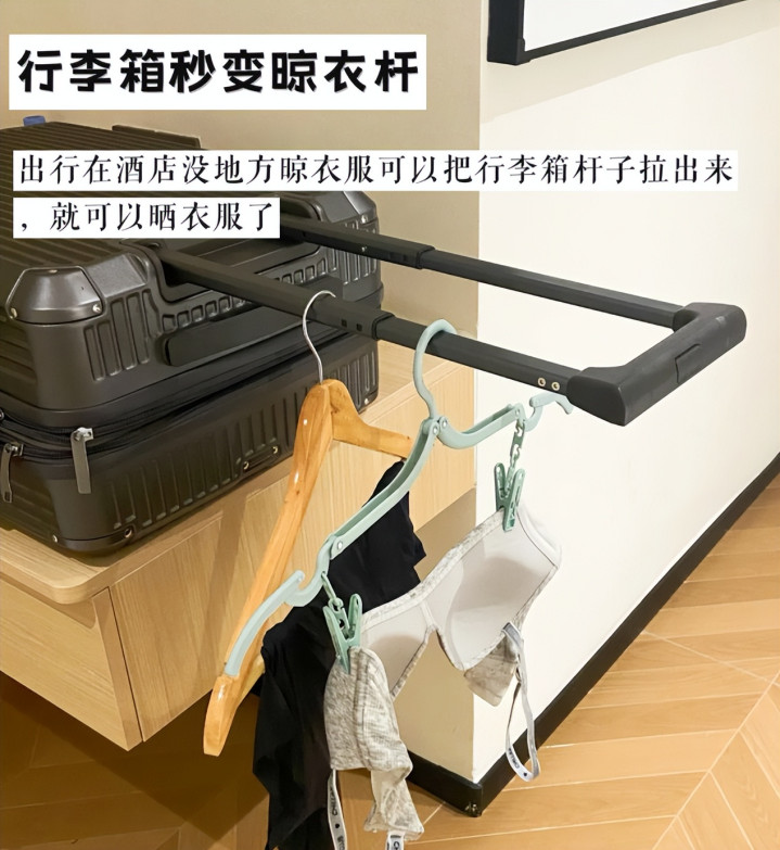 尤其是出门旅行的时候,没地方晒衣服,用行李箱的拉杆晒衣服刚刚好。