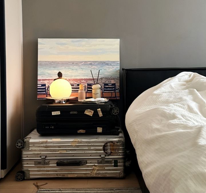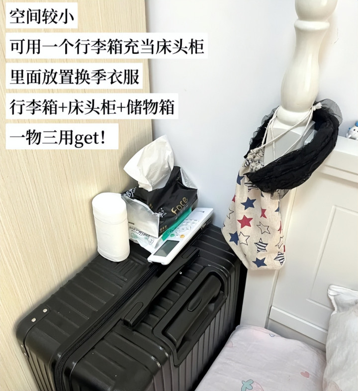租的房子,卧室里面没有床头柜,想着买一个,但是太贵了,看到网友们用行李箱代替床头柜,居然这么实用。