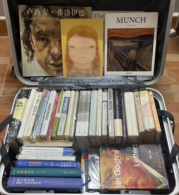 正好家里有闲置的行李箱,把行李箱打开后,书本可以直接放在行李箱里面。