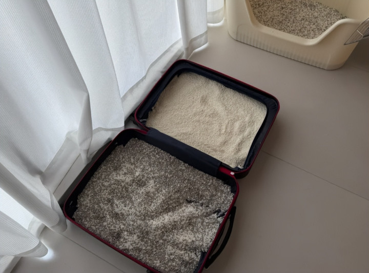 在行李箱里面放上一层塑料布,在把猫砂倒入行李箱里面,直接变成了猫咪的小厕所。