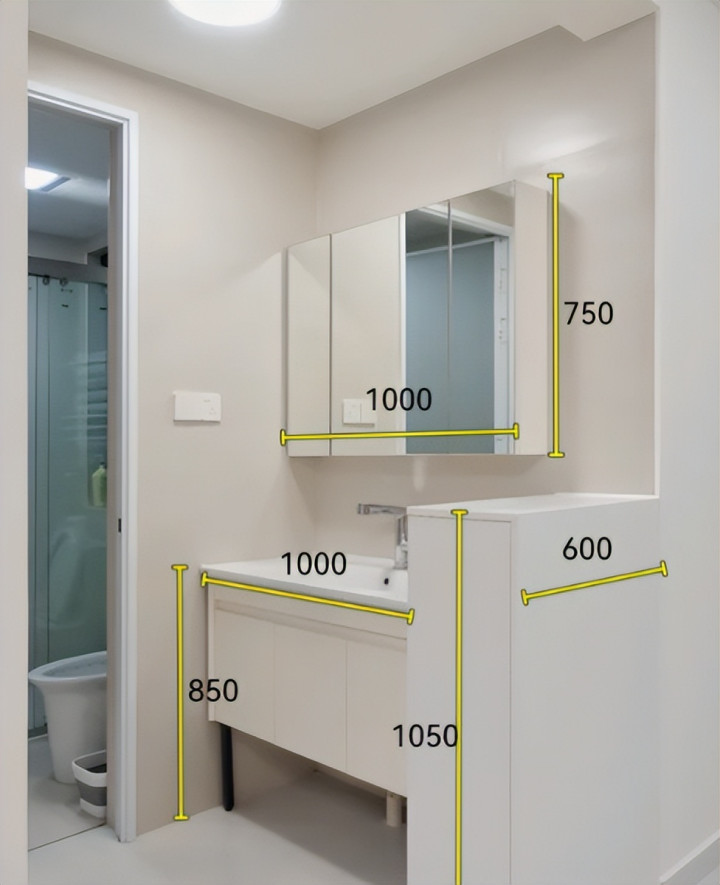浴室柜安装这个细节,很多人都是等师傅贴完砖才开始选柜子,结果尺寸对不上。你要提前说清楚:贴完砖后,洞口要比浴室柜宽2公分,这样安装起来才不会卡,两边还能打玻璃胶,严丝合缝,漂亮又实用。